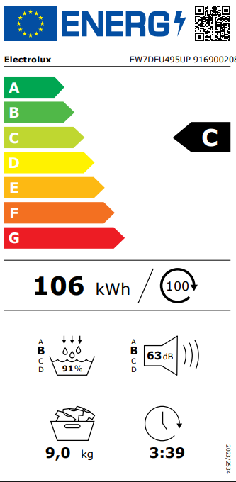„Electrolux EW7DEU495UP” – laisvai pastatoma šilumos siurblio džiovyklė su 9 kg talpa iš PerfectCare 700 serijos. Modelį išskiria DelicateCare technologija, kuri automatiškai parenka temperatūrą ir būgno sukimosi greitį pagal audinio tipą, apsaugodama net pačias delikačiausias medžiagas – vilną, šilką ar sintetiką. Inverterinis variklis užtikrina tylų ir efektyvų darbą, o SensiCare jutiklis nuolat stebi džiovinamos skalbinių drėgnumą ir pagal poreikį koreguoja ciklo laiką bei energijos sąnaudas. Džiovyklė turi Woolmark Green sertifikatą – aukščiausią galimą vilnonių gaminių apsaugos patvirtinimą.